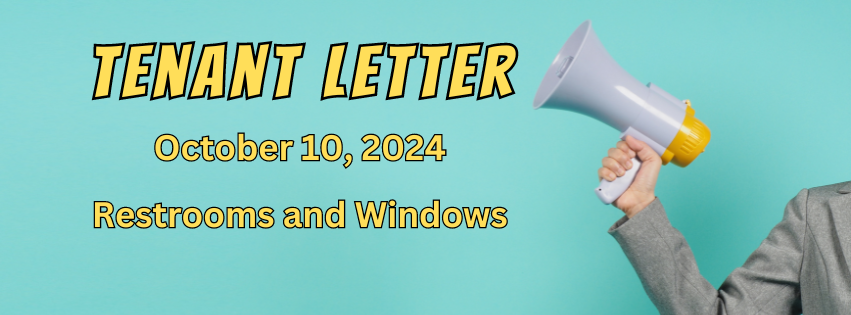 We will also be closing the 1st-floor restrooms this week for demolition and remodeling on Wednesday. Please use the 2nd and 3rd-floor restrooms during this time. We will do our best to minimize disruptions to businesses on the 1st floor and keep noise levels minimal. We apologize for any inconvenience this may cause.